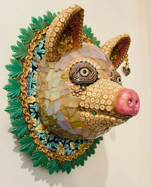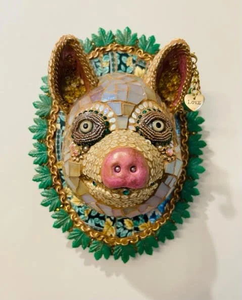 Mosaic pig head sculpture with colorful embellishments and a small heart-shaped tag that reads "Love."