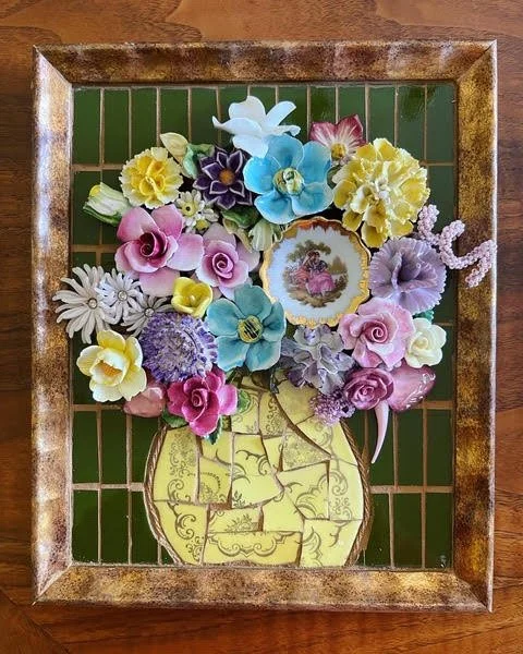 Framed 3D artwork of a colorful flower bouquet in a vase, using ceramic or porcelain pieces against a green tiled background.