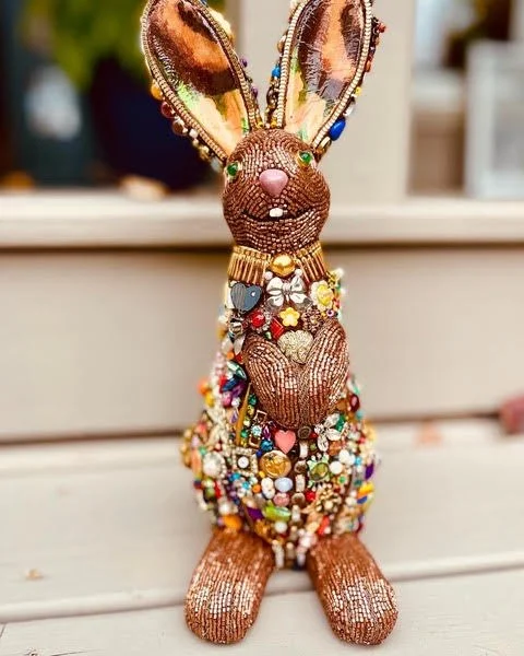 Mosaic rabbit sculpture on metal chair, decorated with floral patterns, beaded eyes, pink nose, and yellow flower adornment on its head.