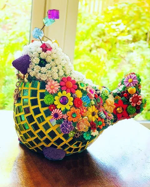 A colorful mosaic bird sculpture decorated with various flowers, beads, and embellishments sitting on a wooden surface.