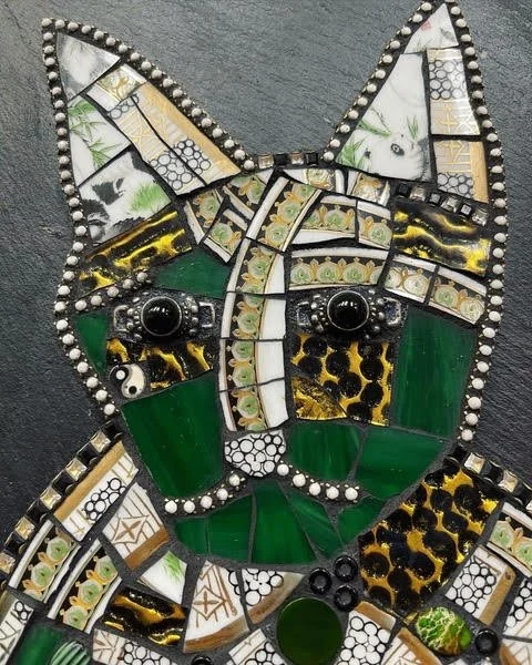Mosaic artwork of a cat with geometric patterns in green, white, gold, and black tiles.