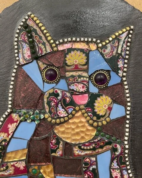 Mosaic artwork of a cat with vibrant colors and intricate patterns, featuring blue, pink, and floral designs on a textured surface.