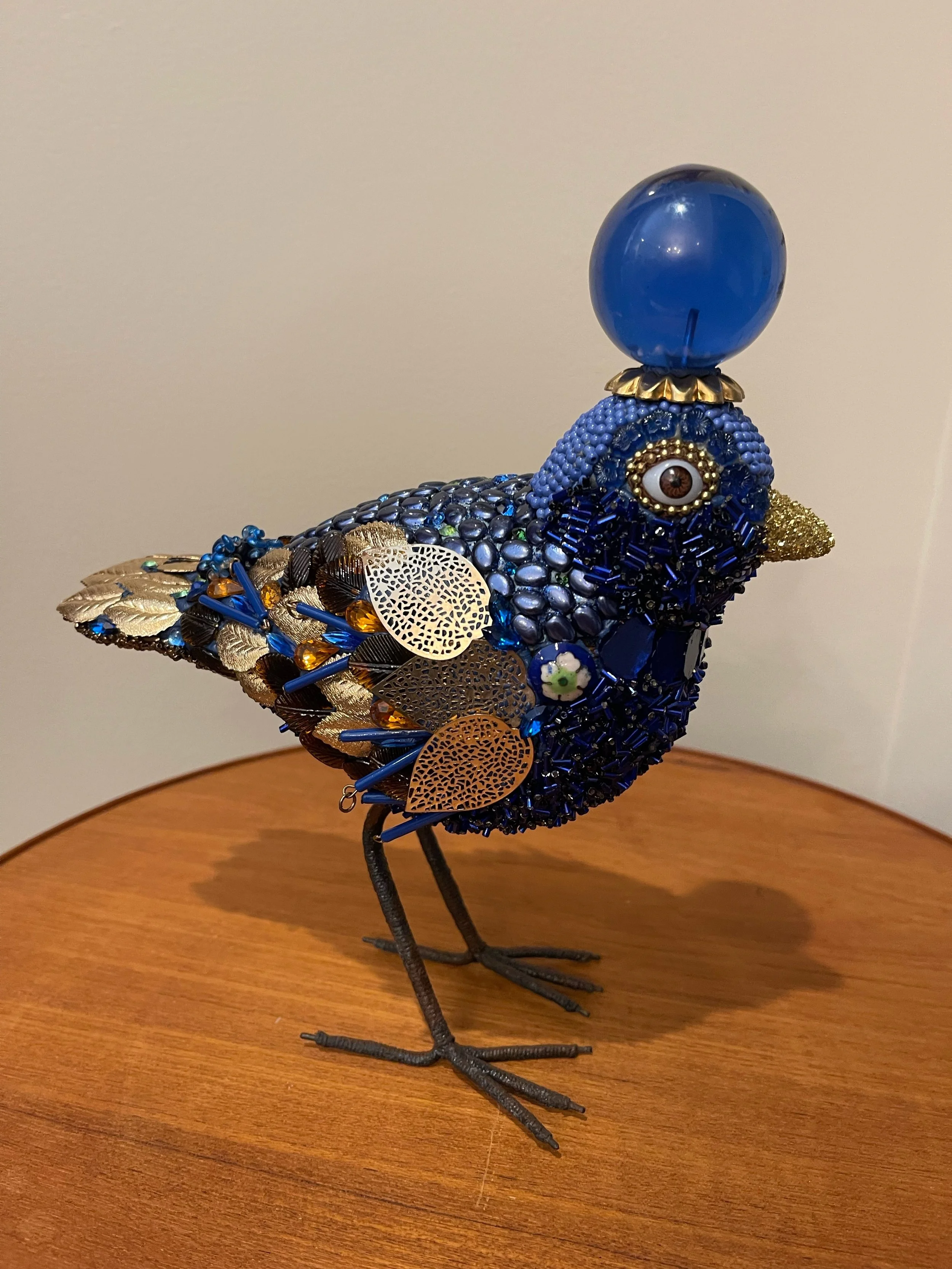 Decorative bird sculpture with blue gemstones and embellishments on a wooden surface.